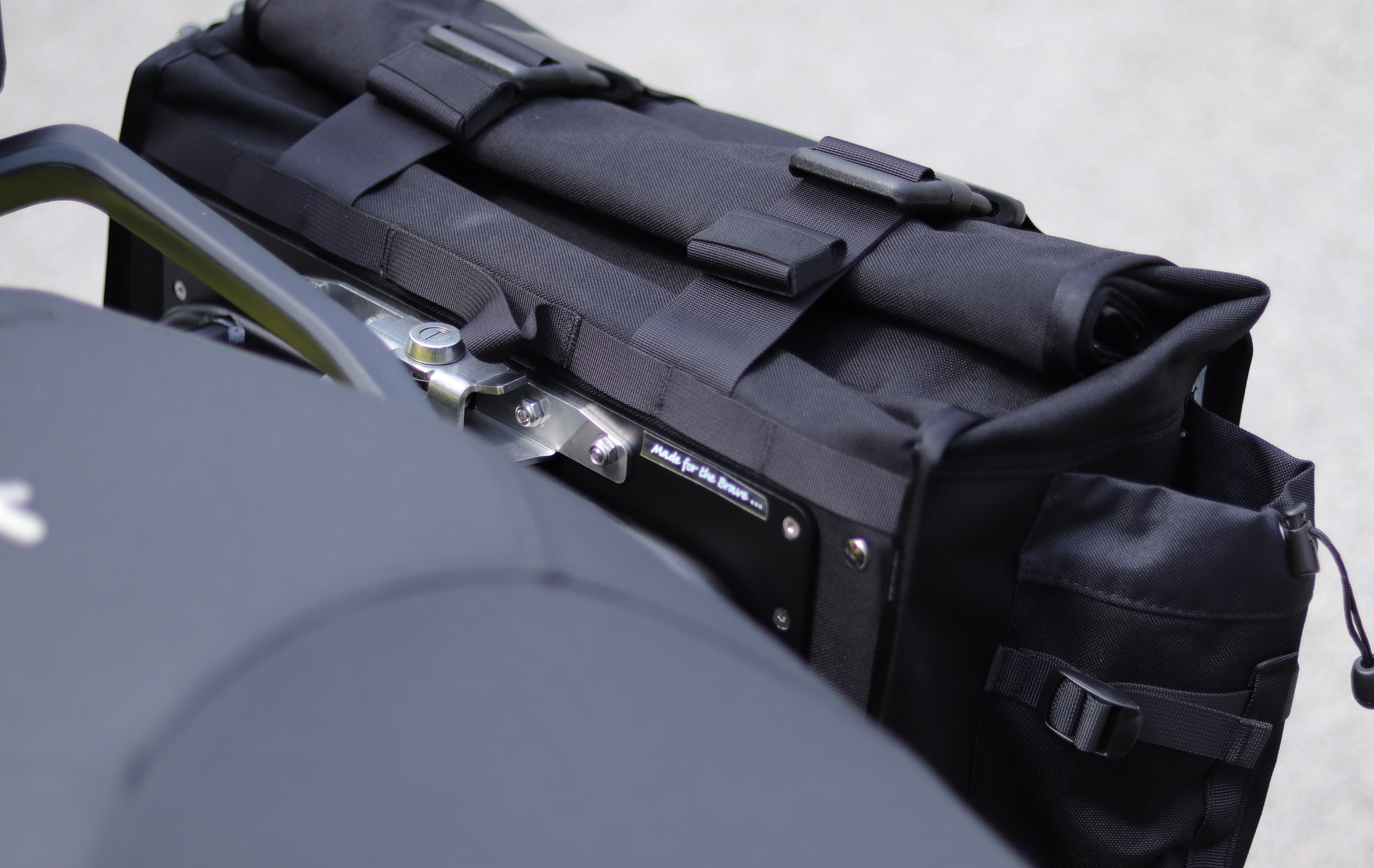BUMOT offers the only lockable, quick-release soft luggage system that allows you to interchange aluminum and soft panniers in seconds - no adapter plates, no extra hardware, no loose straps, just a rock-solid, waterproof solution for your off-road adventures. Xtremada soft panniers offer the mounting convenience of aluminum panniers with the lighter weight and off-road benefits of soft luggage. The system is perfectly symmetrical from the center line of the bike due to the exhaust cut-out - no more having to live with an asymmetrical system or trying to get close by using different sized bags.
