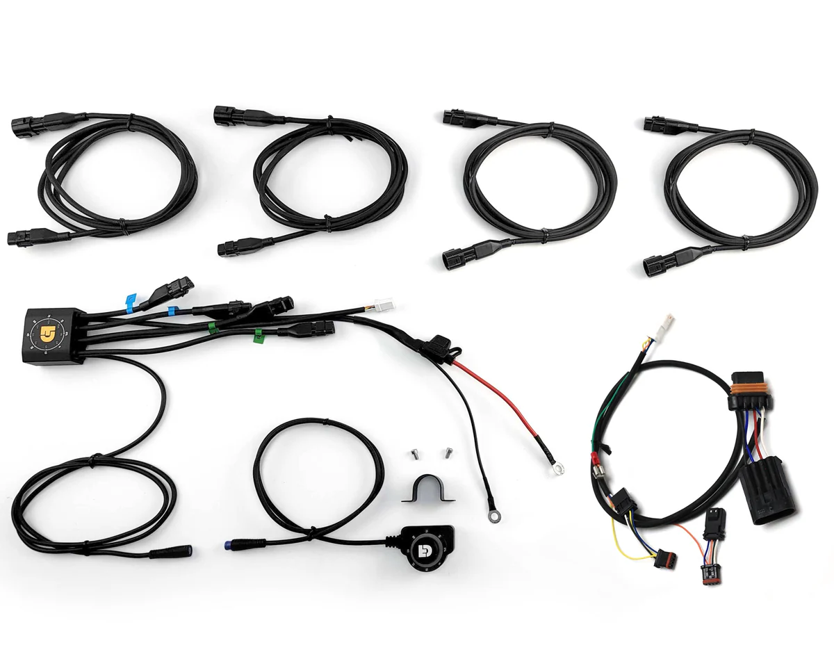 The DialDim Lighting Controller combines smart control and sleek design in one compact system. Its multicolor LED halo switch lets you independently turn on, off, and dim two sets of 3-wire auxiliary lights from a single harness. The blue halo manages light set one, the green manages light set two—just double-click to switch between them and adjust brightness on the fly.