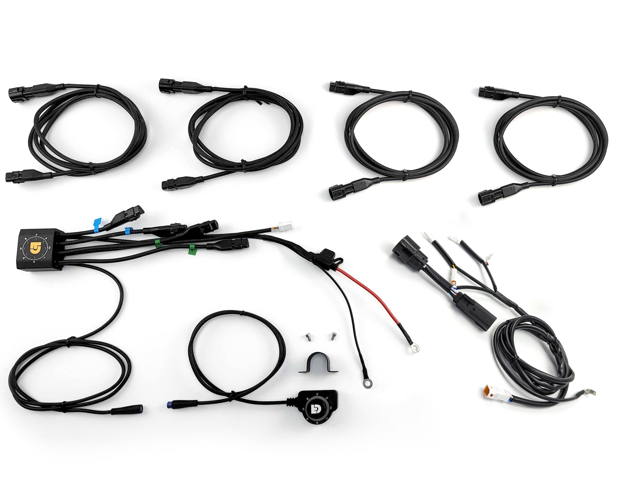 This pre-configured product bundle includes our standard DialDim Lighting Controller and a Ducati DesertX plug-&-play wiring harness. The vehicle-specific harness simply plugs in-line at the DesertX headlight, horn, and turn signal connectors to enable dozens of useful lighting features and settings!