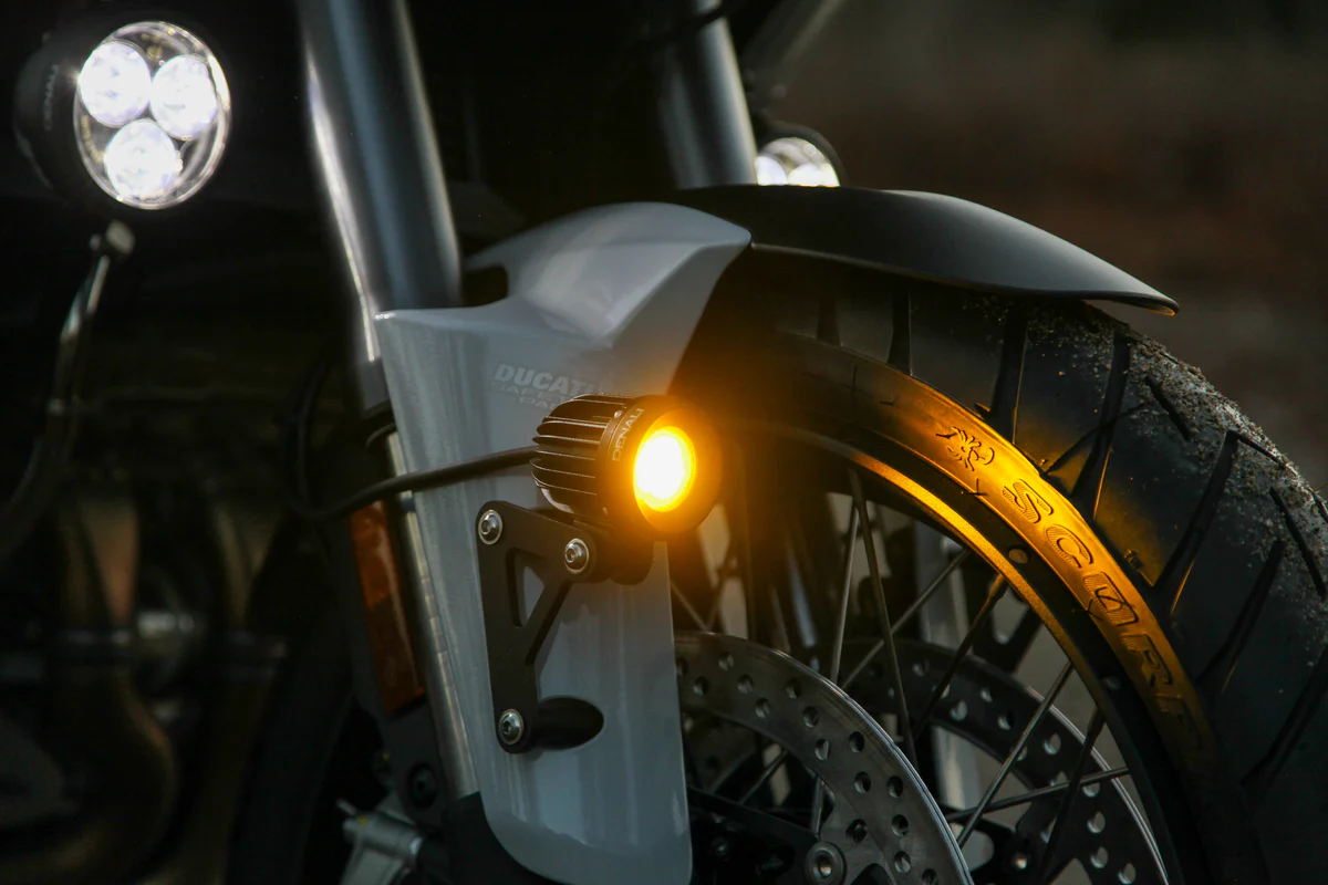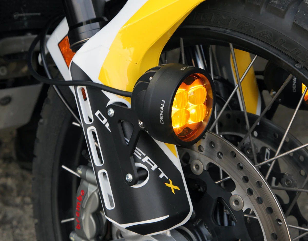 This custom-fit driving light mount is designed to securely install DENALI DM, D2, D3, and S4 lights in a low-profile position, optimizing visibility during daytime driving. The kit includes rugged, powder-coated steel brackets with an M8 mounting hole, along with all necessary installation hardware.